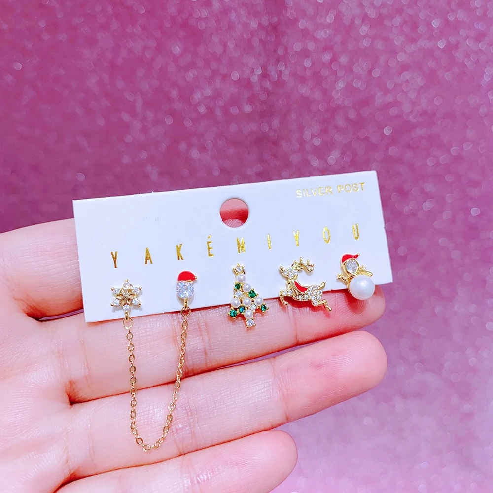 MIGGA 5pcs Mixed Christmas Stud Earrings Set Gold Color Plated Cubic Zircon Women Earrings Party Jewelry